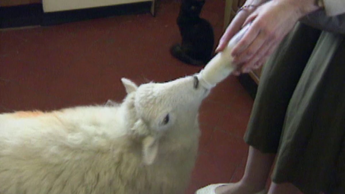 Lamb Chop was rejected by her mother, so owner Rachel hand-reared her. As a result Lamb Chop now thinks she's a dog and exhibits canine mannerisms.