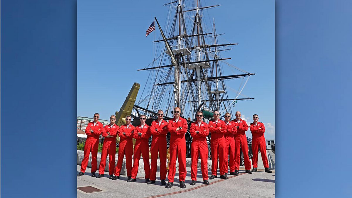 The Red Arrows team talk with William Wright just before they leave the UK for North America.