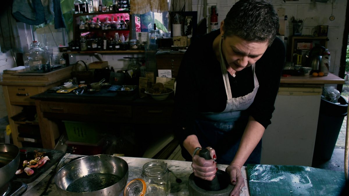 Catherine gathers and works with natural materials to make inks and dyes in order to create her own works of art.