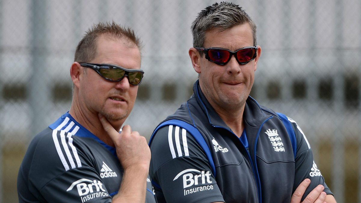 Photo: England director of cricket Ashley Giles and former bowling coach David Saker during a nets session in 2013 (Getty Images)