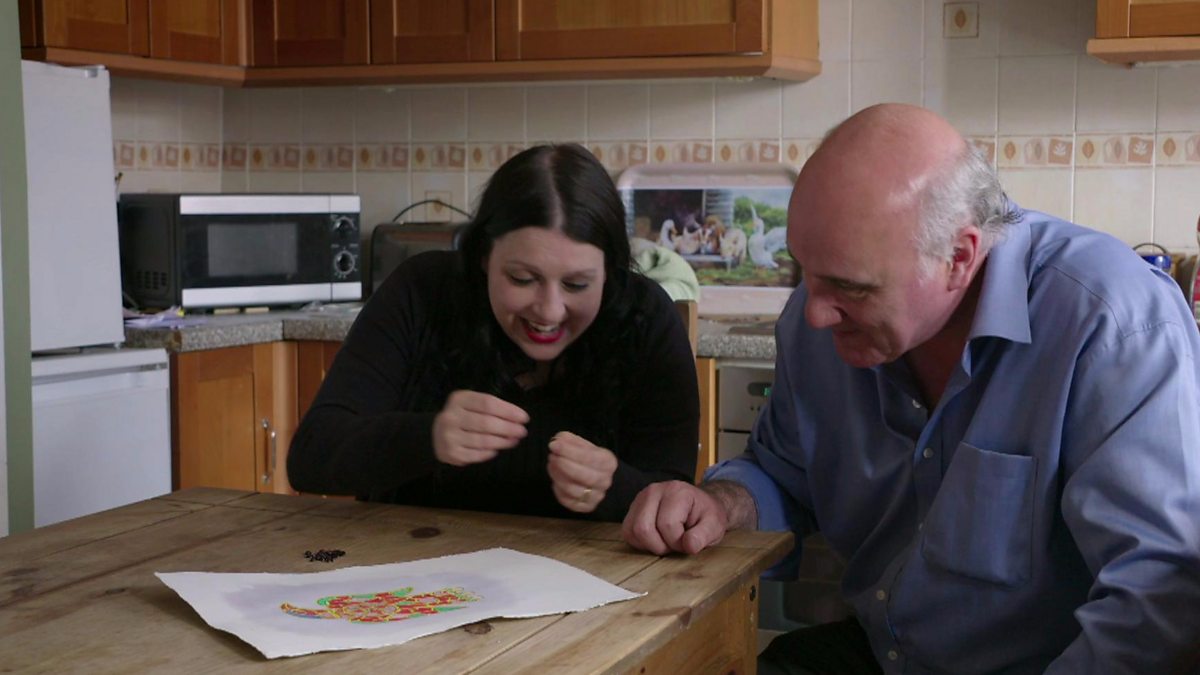 Oxford historian Dr Janina Ramirez arrives in Bolton to see Shaun Greenhalgh's design for the Visigothic eagle brooch. She is excited to see the garnets have also arrived.