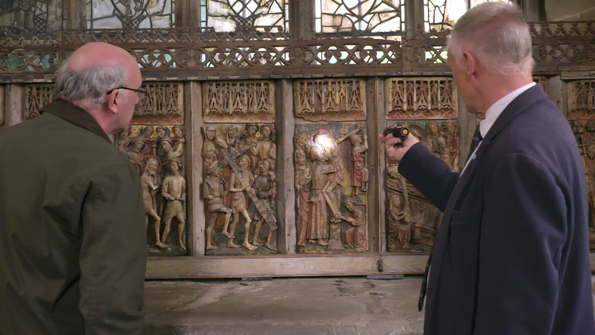 To get inspiration for his Nottingham Alabaster, Shaun visits Haddon Hall, where he is shown their collection of alabaster panels.
