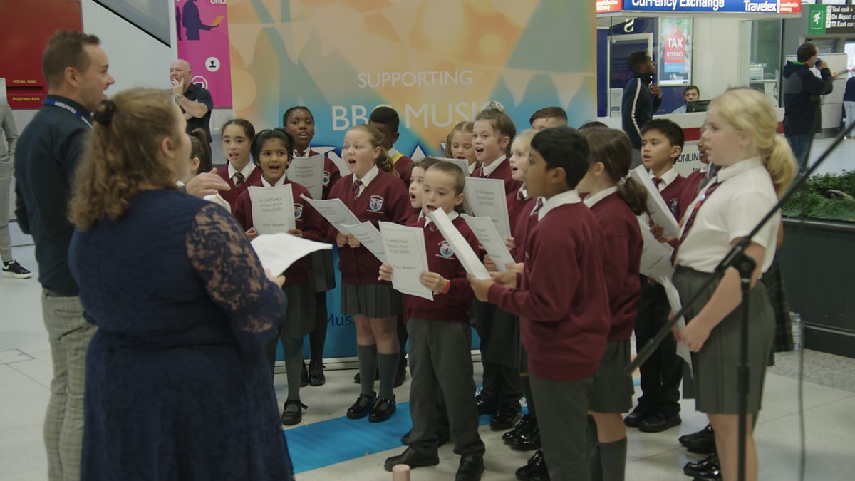 Choirs including the Heartbeat Chorus and St Anthony's School Choir perform at Manchester Airport for BBC Music Day 2019.