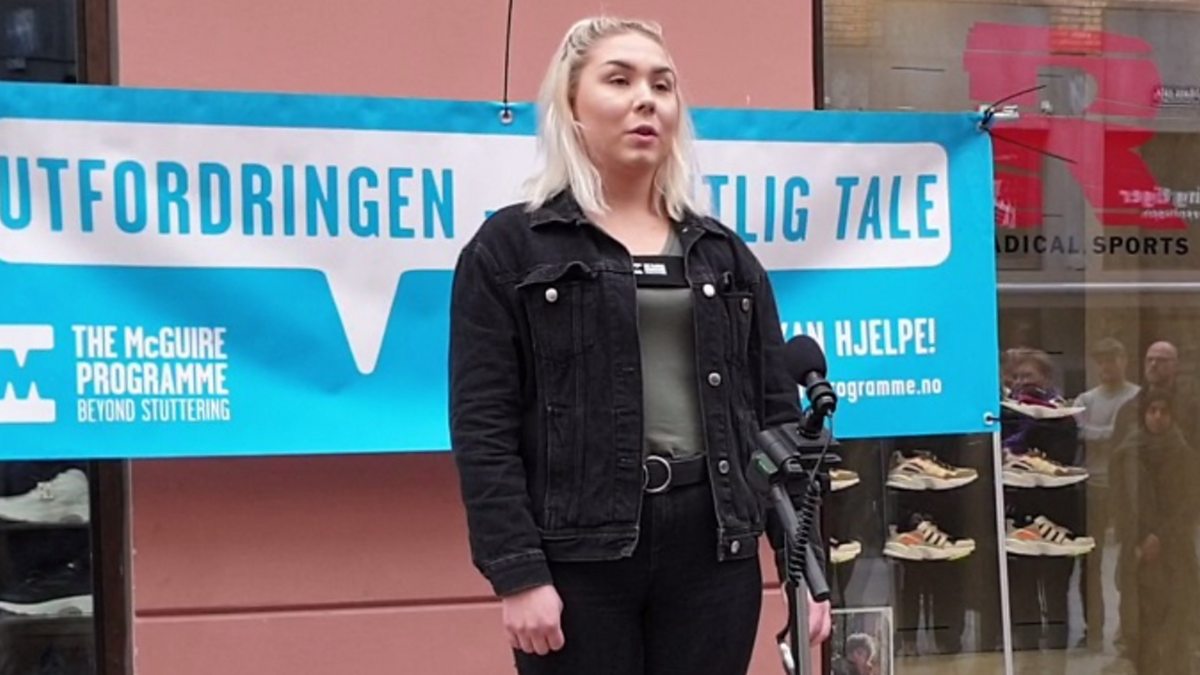 (Image: Stutterer Signora gives a public speech on a box in Oslo city centre. Credit: BBC.)