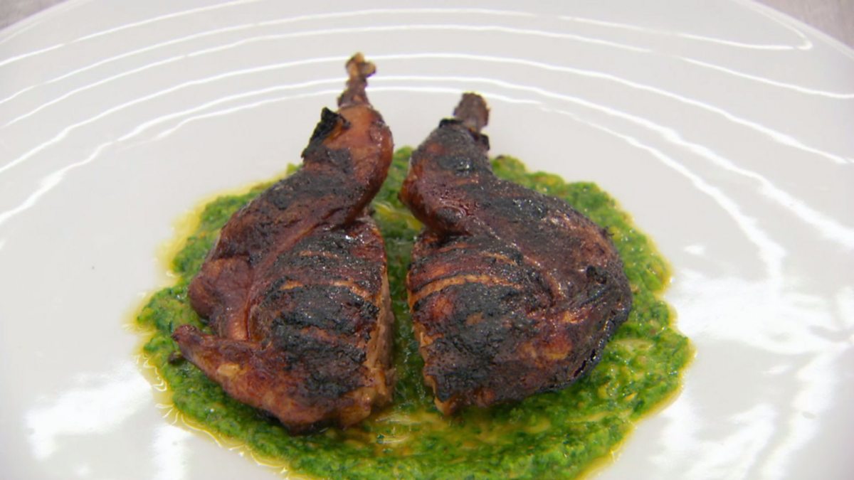 This test has been designed by Monica, who demonstrates how she would spatchcock a quail and make a rocket pesto from a table of ingredients in 15 minutes.