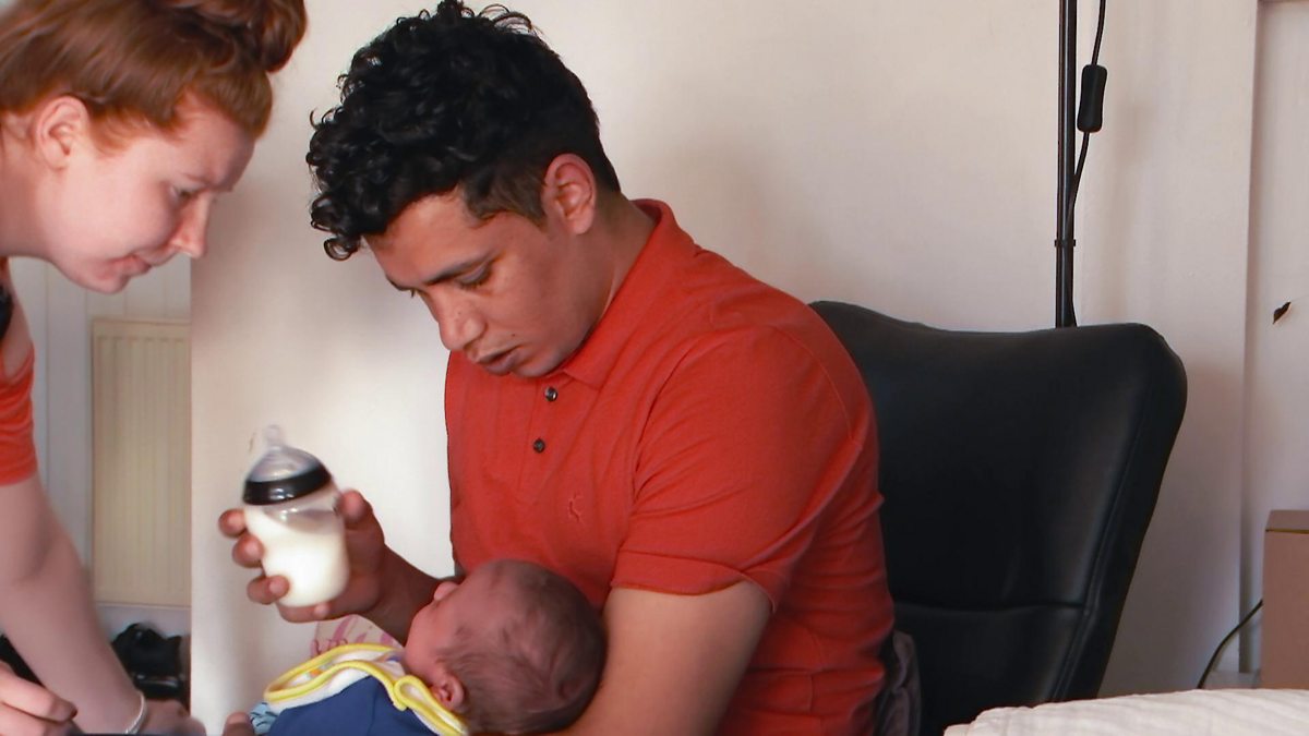 Dad Mo gets to grips with feeding his baby son Amr-Ace.