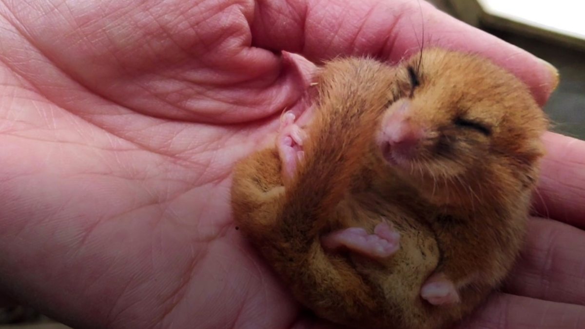 (Image: A dormouse in torpor on someone's palm. Credit: Wildwood Trust.)