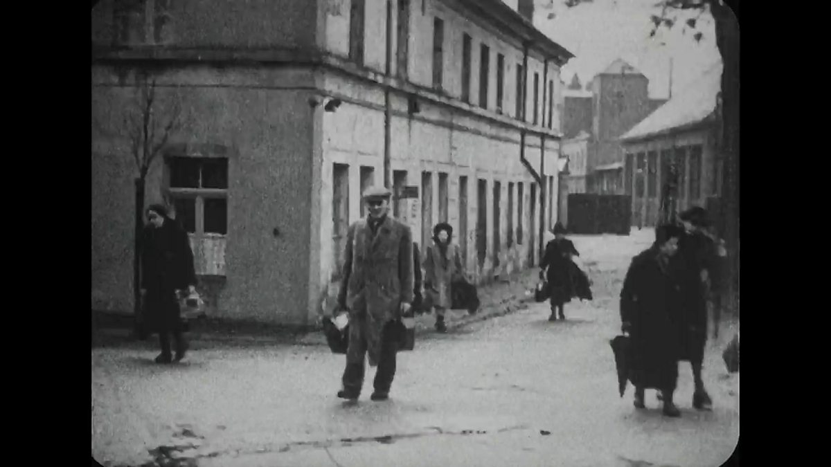Historian James Holland and Professor Nicholas Stargardt view home movie footage of the Dresden deportations.