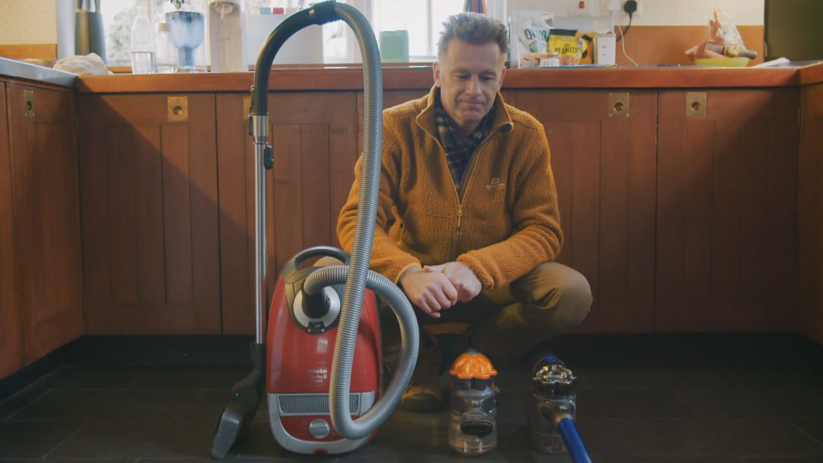 Chris demonstrates his own possessions and "notorious excess" - 10 vacuum cleaners to satisfy his cleaning habit. While the financial cost of many of our everyday gadgets may be small, the environmental cost is incalculable.
