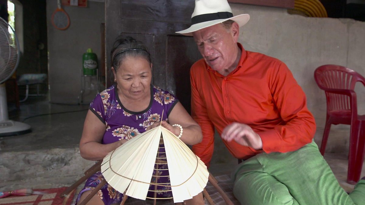 In the rural villages surrounding the imperial capital of Hue, artisans weave traditional conical hats. Michael is keen to help.