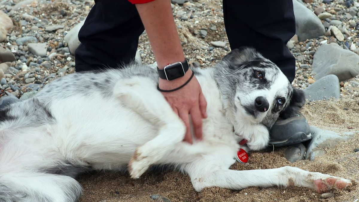 Two smart search and rescue dogs, both called Izzy, search out Derek the Weatherman as he puts them to the test near Conwy, North Wales.