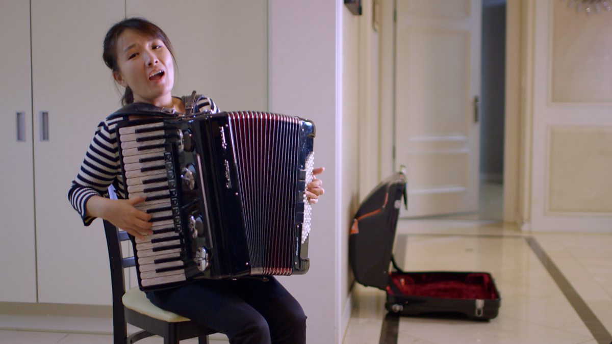 Photo: Yu Hyun-joo with her accordion Credit: BBC