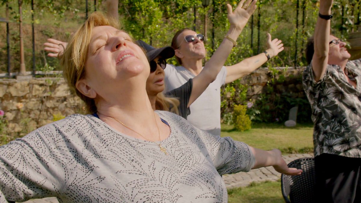 The group take part in a morning yoga and meditation session in the foothills of the Himalayas.