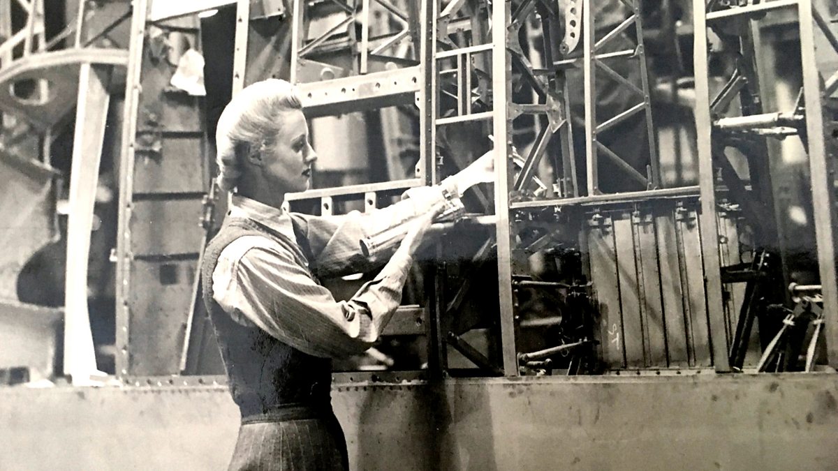 Image: Dorothy Handel, AID Inspector, examining a Spitfire in production. Credit: Family of Dorothy Handel.