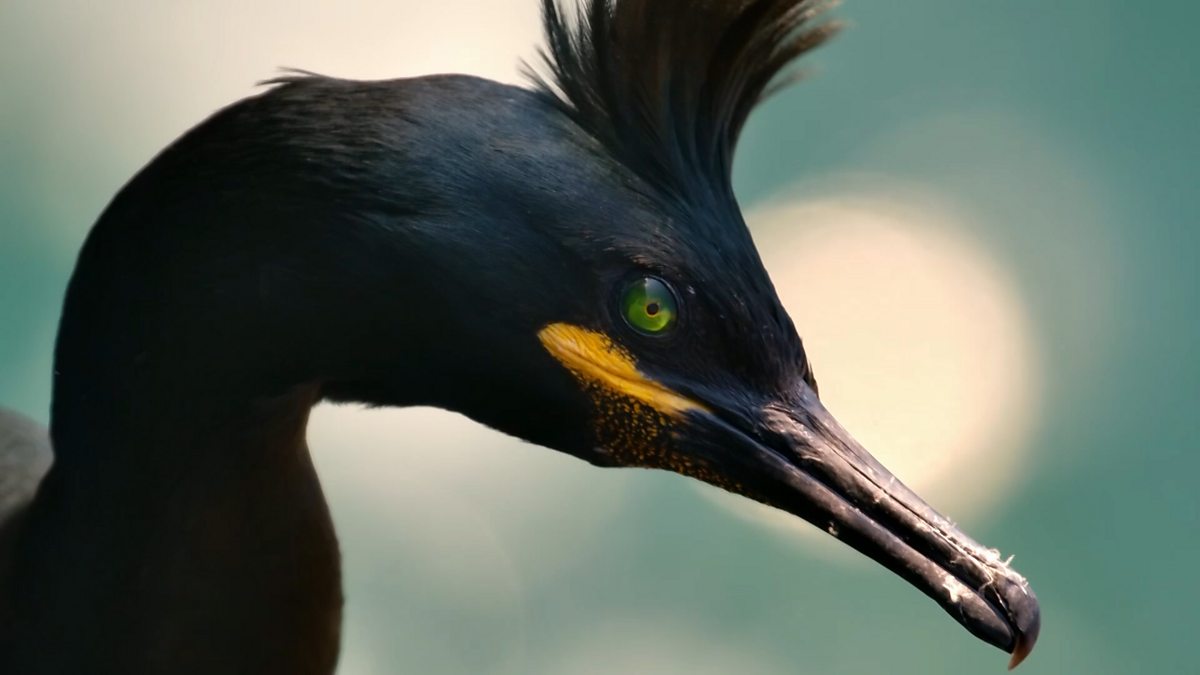 Shags on the coast of Land's End face the elements to steal nesting material.
