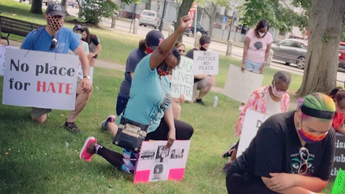 (Photo: protesters in Bridgewater, Massachusetts, take the knee. Credit: Melvyn Purefied)