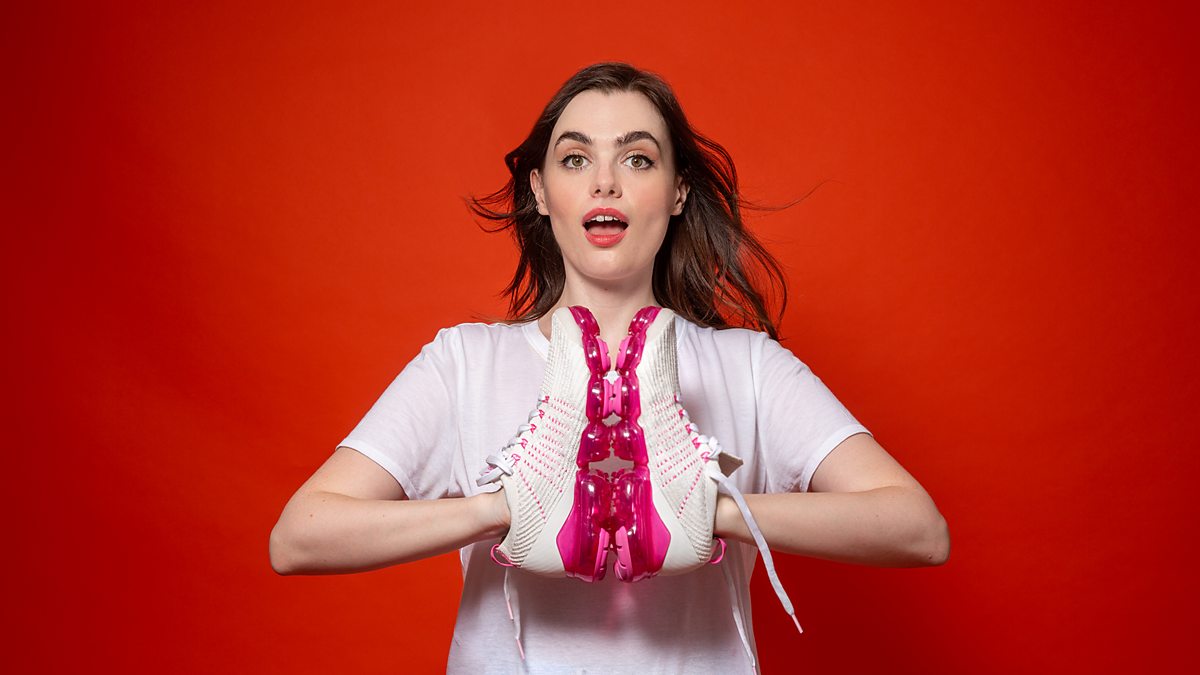 Image: Presenter Charli Howard holding up a pair of trainers (model's own)
