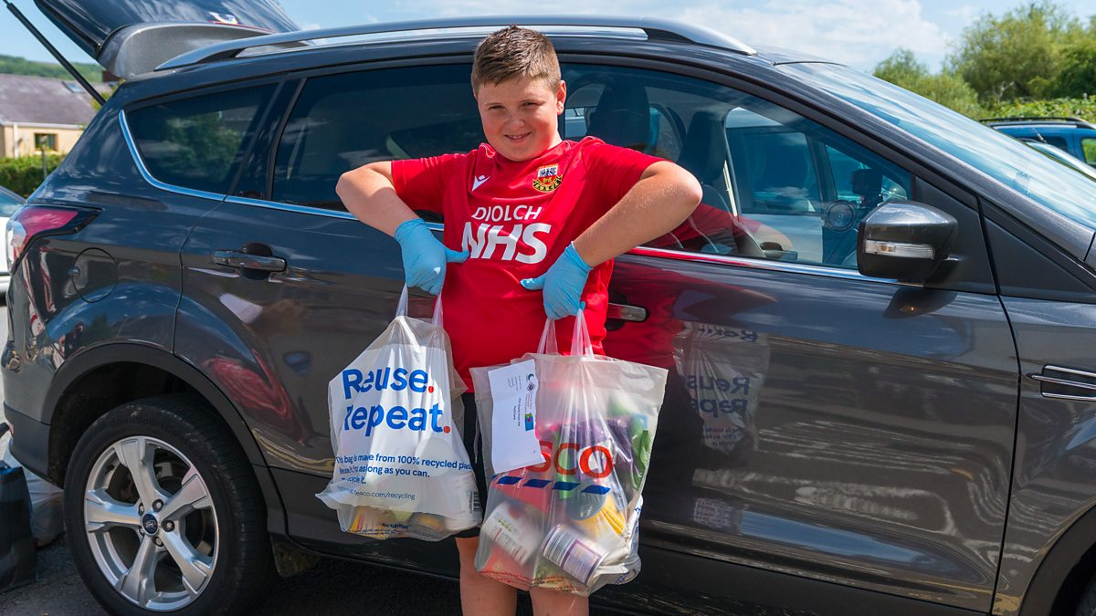 Mae Dyfan wrthi'n gwneud gwaith pwysig yn cludo pecynnau bwyd i'w banc bwyd lleol, Glanaman. Dyfan is on an important journey, delivering food parcels for his local food bank in Glanaman.