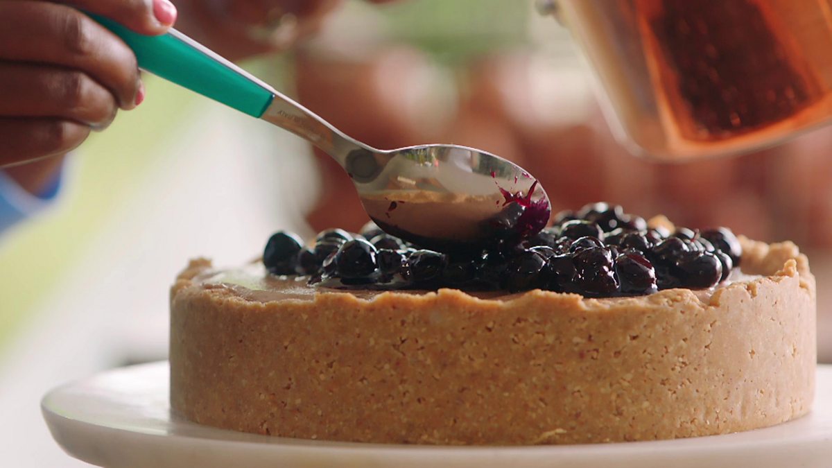 Nadiya creates a delightful, frozen banana and blueberry cheesecake that is not only delicious but vegan too!