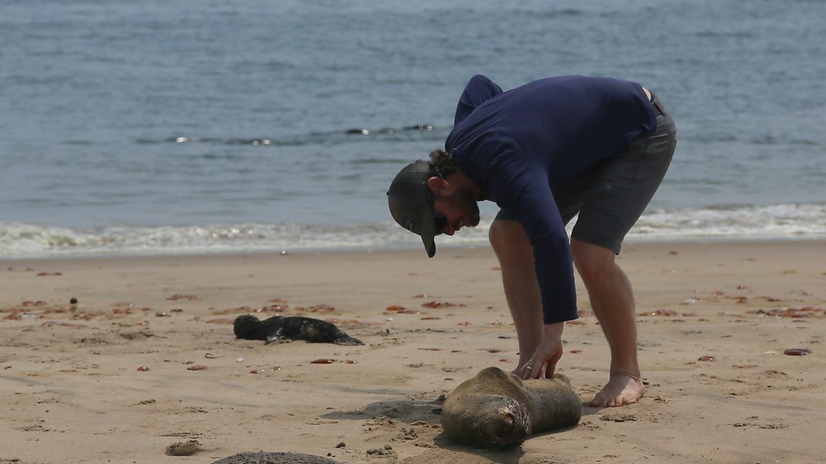 (Photo: Scientist inspects a seal. Credit: Dr Simon Elwen - Namibian Dolphin Project. Video courtesy of Ocean Conservation Namibia and the Namibian Dolphin Project)