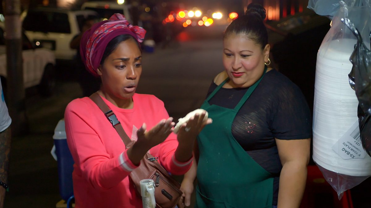 During a visit to a Guatemalan market in LA, Nadiya tastes and learns to make pupusa - a thick corn tortilla, stuffed with meat, cheese or veg.