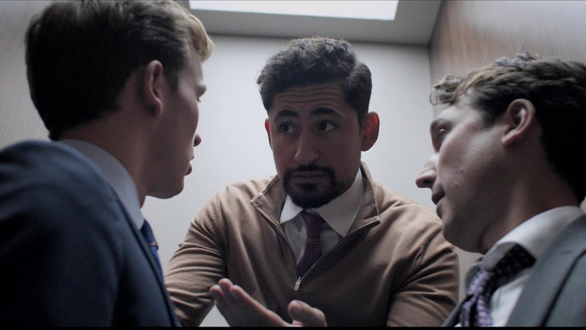 At the Pierpoint Christmas party, Usman leads Robert and Greg into a toilet cubicle to hand out his pills.
