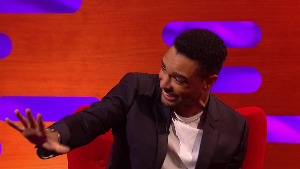 Regé-Jean Page talks about his family's reaction to the steamy scenes in Bridgerton and reveals that there were room minders on set to make sure that none of the period furniture got damaged during filming.