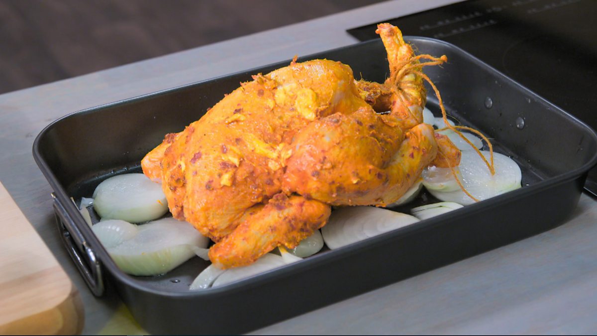Karim adds a kick of flavour to his roast chicken with harissa butter.