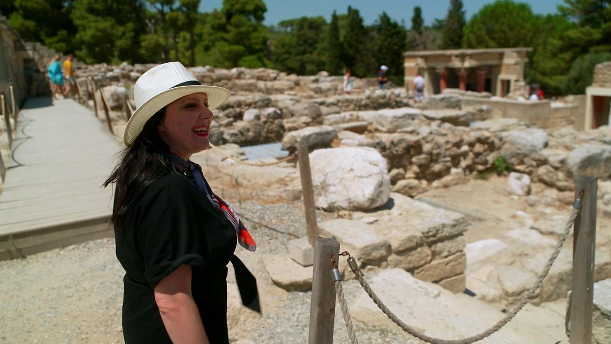 Presenter Dr Janina Ramirez in Crete walking around The Palace of Knossos, the real palace behind the myth of the Minotaur, and the centre of the Minoan Empire