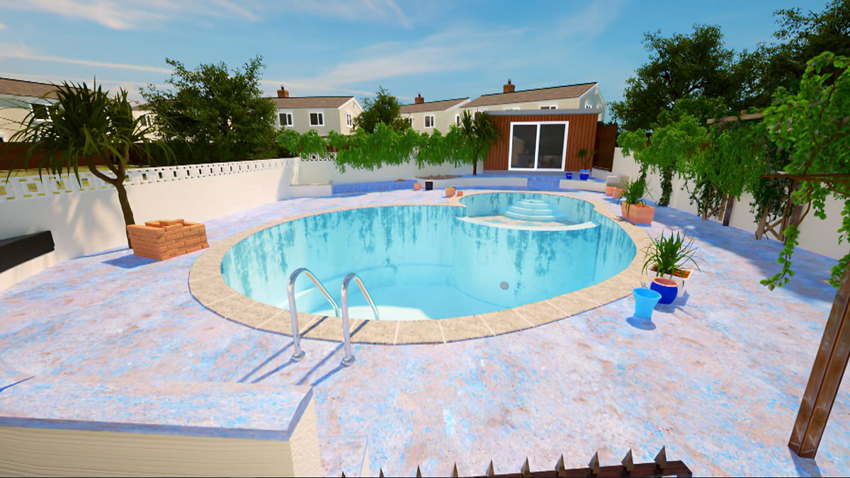 Angela Scanlon and Tom Massey watch on from the glasshouse, as designer Pip Probert demonstrates to Suzanne and Andrew why simply filling in their derelict pool would be a waste of money.