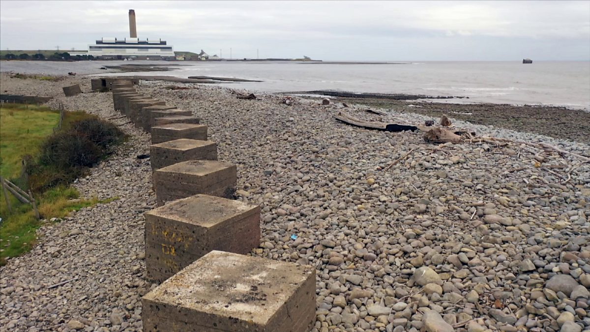 An impressive line of concrete cubes built to keep an enemy out and some etched with the names of those who built them.