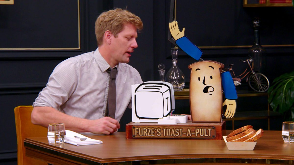 British shed inventor and video maker Colin Furze, brings in to the judging chamber his latest crazy invention; a toaster for catapulting toast!