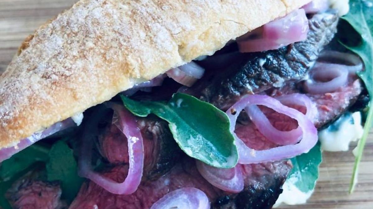 A steak and blue cheese mayo sarnie with shallot pickle courtesy of Pop up Sarnie.