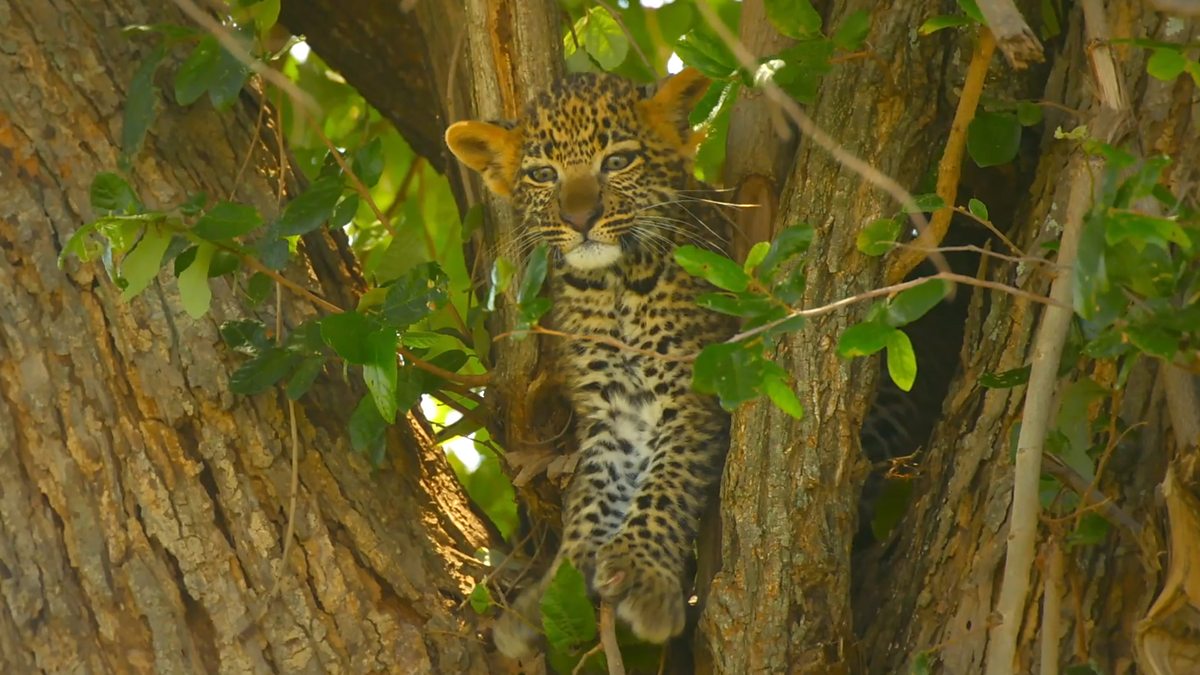 With the jaws of hyena Zalika close by, leopard cubs Mzuri and Dada have to quickly learn how to climb a tree.