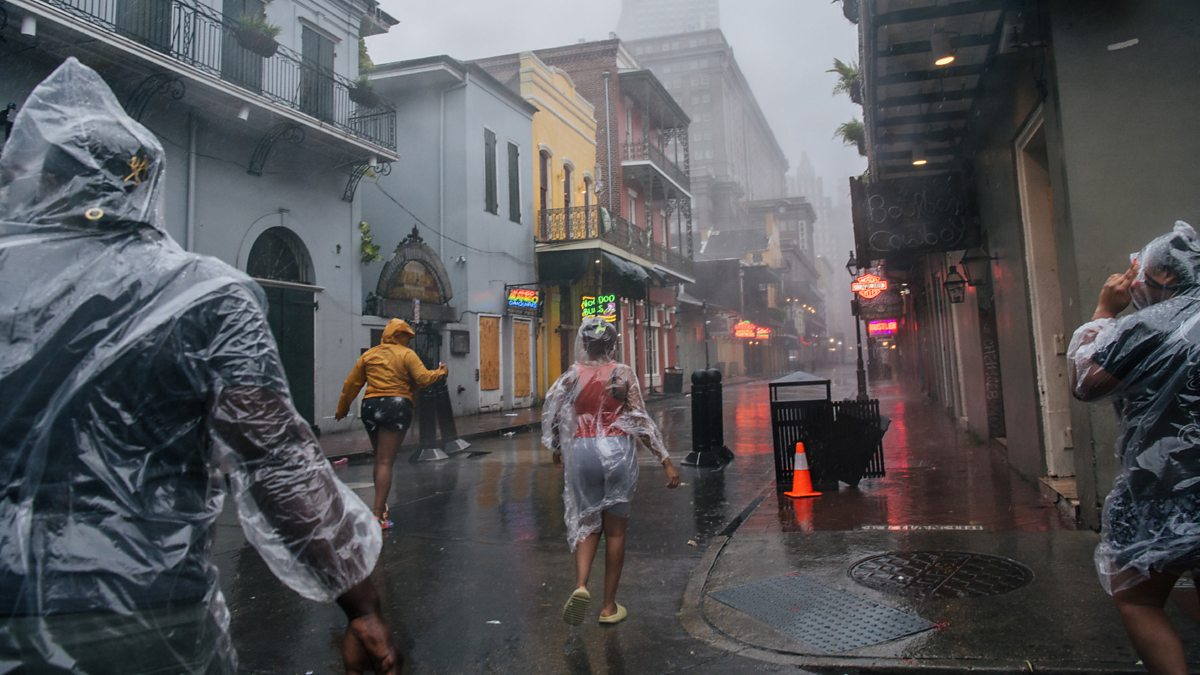 (Image: A group of people walk through the French District during Hurricane Ida on August 29, 2021 in New Orleans, Louisiana, Credit: Brandon Bell/Getty Images.)