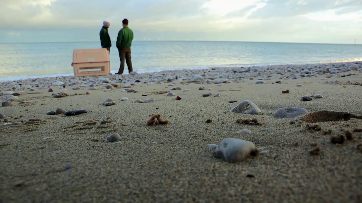 Zookeeper Rhod has the honour of releasing a young seal back to the wild.