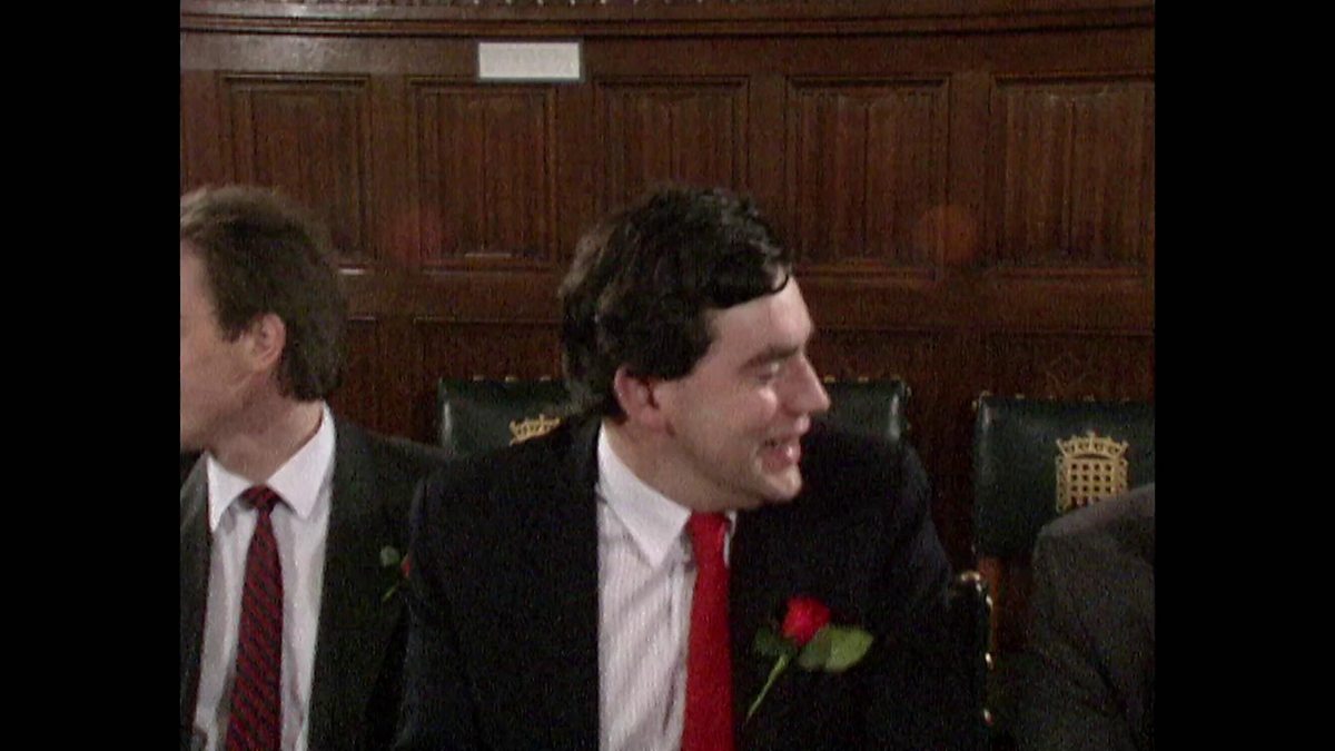 As young members of the Shadow Cabinet, Gordon Brown teaches his younger colleague Tony Blair how to deliver a captivating speech.