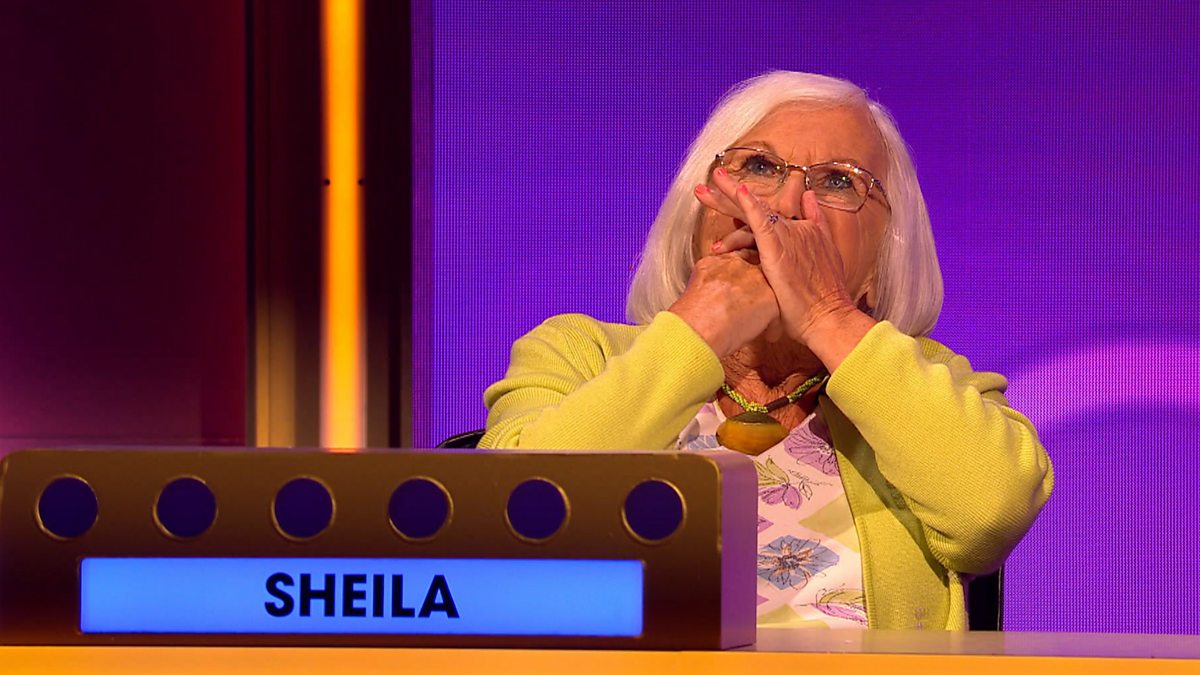 Contestant Sheila tests Bradley's ear for birds with an impression for him to guess.