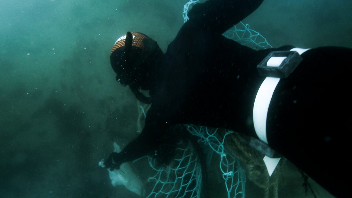 Gwylia grŵp o sgwba-blymwyr gwirfoddol yn achub bywyd gwyllt y môr.