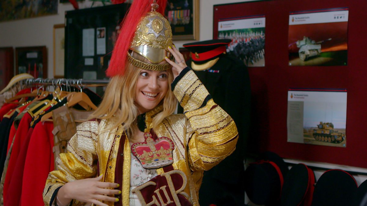 Pixie tries on the uniform that her 3x great grandfather would have worn as part of the Household Cavalry.