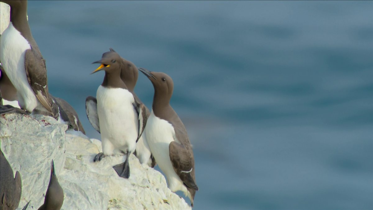 Predatory gulls fly along the clifftops in search of a guillemot egg.