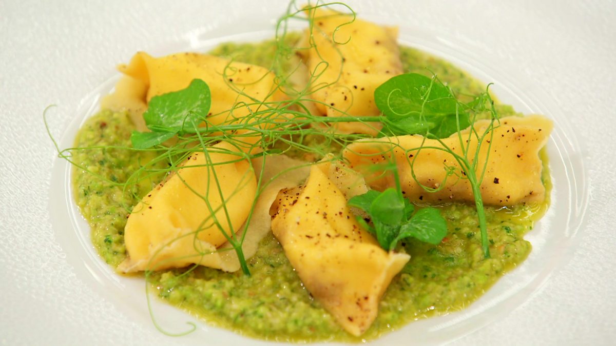 This test has been designed by Monica, who demonstrates how she would prepare and cook Agnolotti filled with Burrata and Sundried Tomatoes served with a Pea and Mint Pesto.