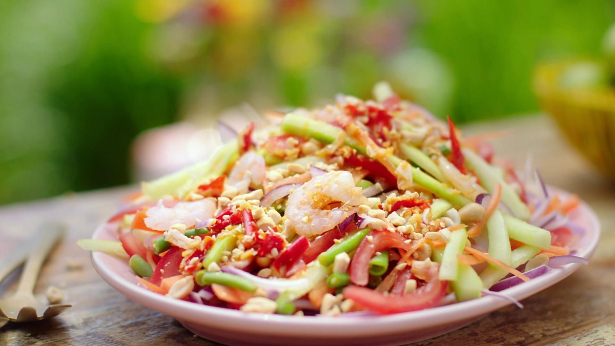 Nadiya has created a unique version of a Thai classic, using cucumber as well as juicy prawns and a punchy dressing packed with sour, sweet, tart, and spicy Thai flavours.