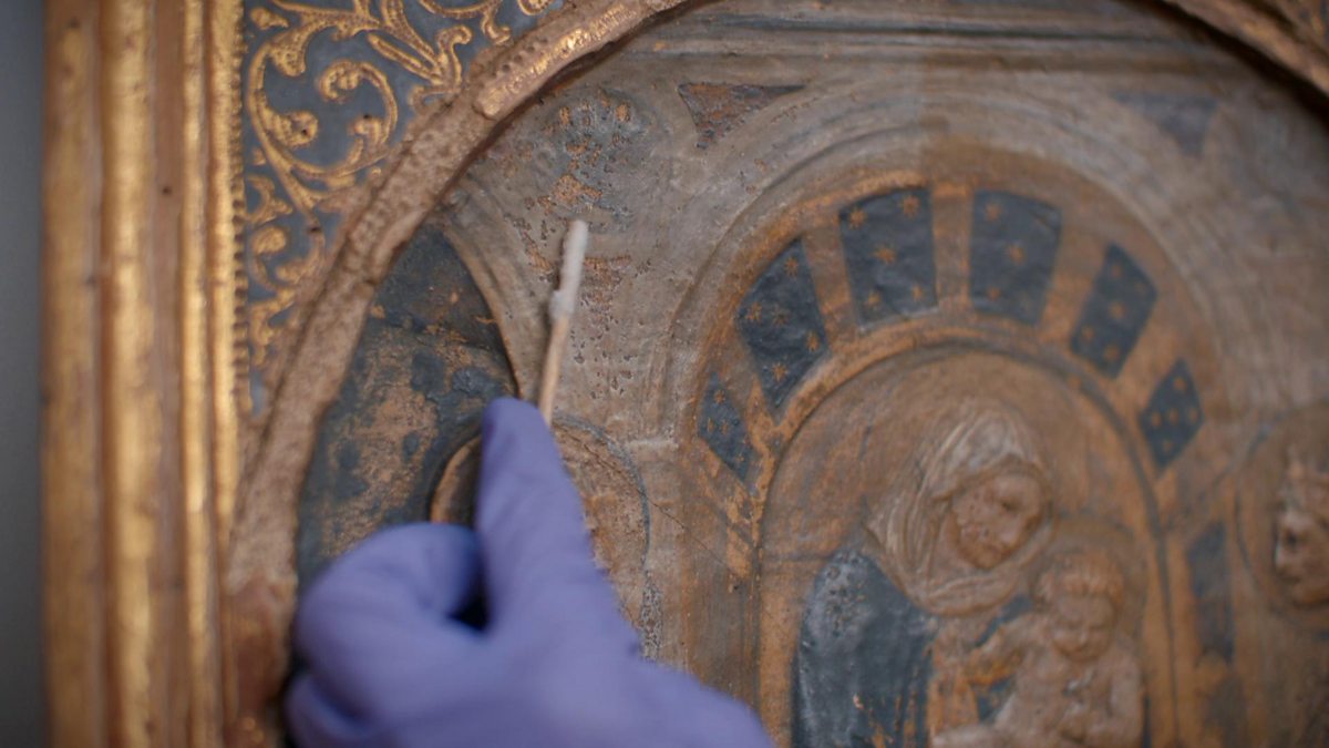 Conservator Adriana must carefully clean the varnish off a rare example of a stucco from the workshop of Donatello. Adraina's skilful work brings the original colours to life.