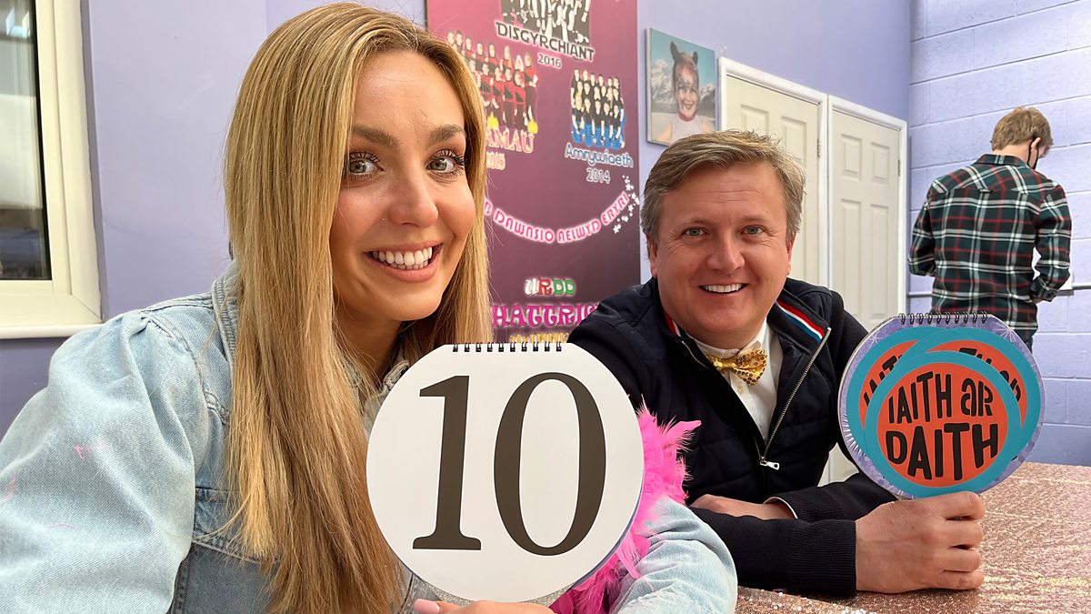 Tro ma, dawnswraig 'Strictly', Amy Dowden, sy'n ceisio dysgu Cymraeg, gyda help ei mentor, y cyflwynydd a'r canwr Aled Jones. With Strictly dancer Amy Dowden and presenter/singer Aled Jones.