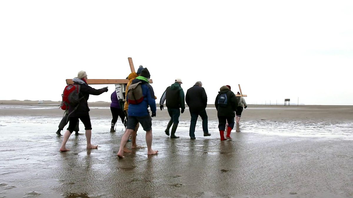 With the tide safely out, Sean Fletcher joins the Northern Cross pilgrims walking to the Holy Island of Lindisfarne in Northumberland