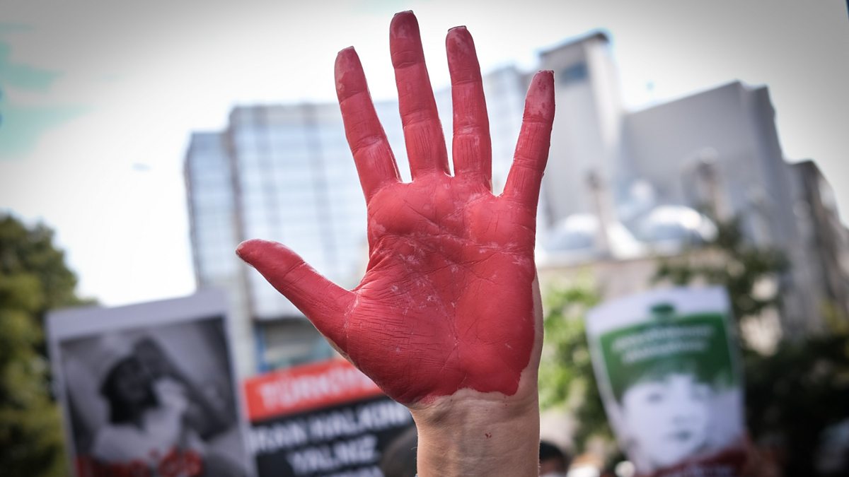 (Photo: Protesters paint their hands red during a protest outside the Iranian Consulate, in Istanbul, Turkey, 11 October 2022. Credit: Sedat Suna via EPA-EFE/REX/Shutterstock)