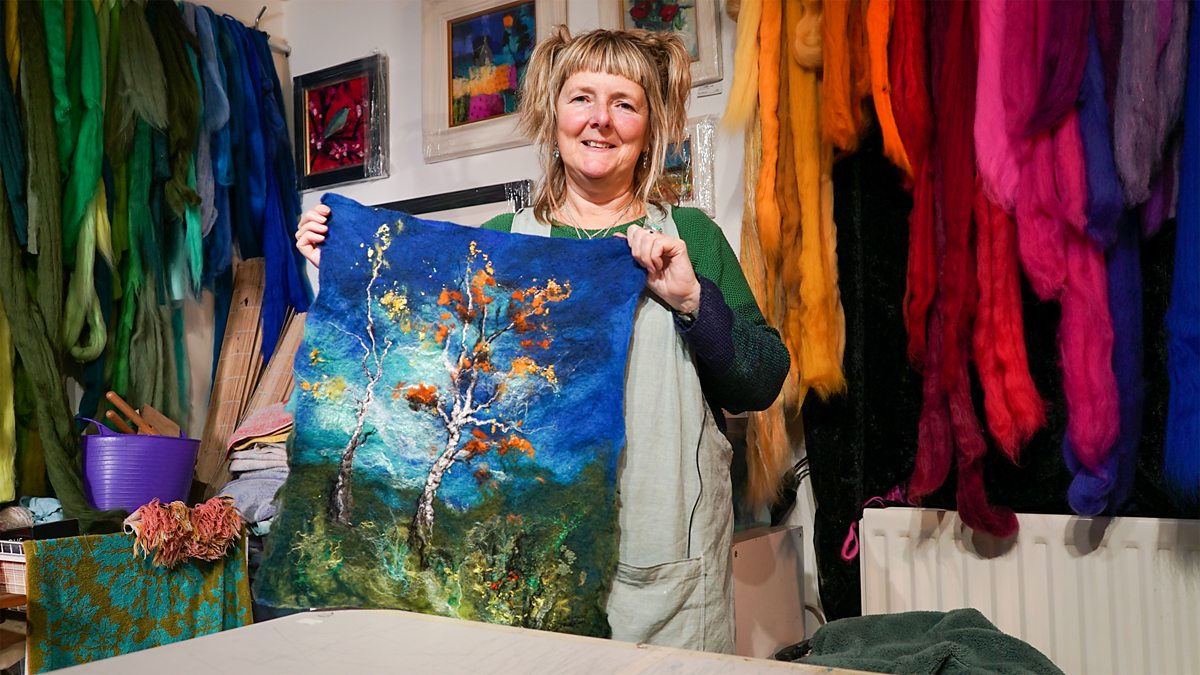 A strong believer that art should be for everyone, and that crafts deserve to be acknowledged as art, Moy places textiles in an artworld context in order to highlight their importance. A meditative, thoughtful and intricate process, she often loses herself in the felting. We join Moy in the gently stunning environs of the Tweed Valley, where she draws inspiration for her latest artwork, and then follow her to her local gallery/workshop to watch as she makes one of her unusual felted paintings.