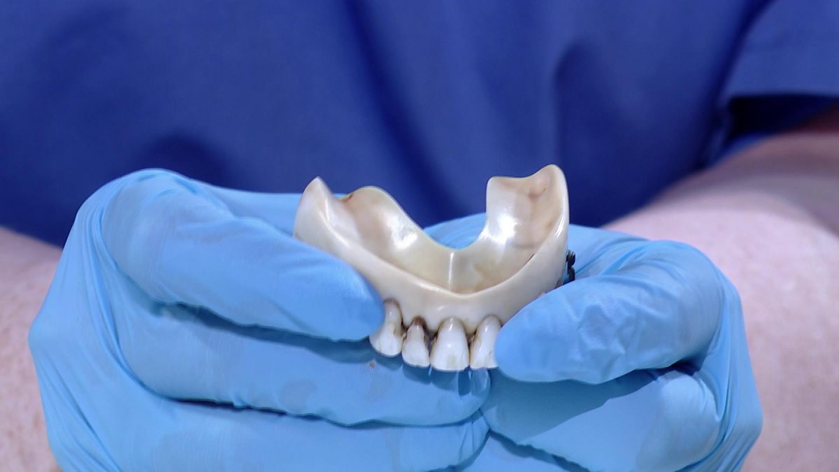 Prof Dame Sue Black shows the audience a set of historic dentures that feature real teeth called 'Waterloo Teeth.' Women were paid to extract these teeth from dead soldiers on the battlefield, and sell them to dentists.