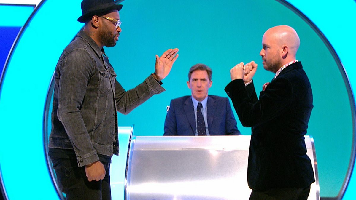 Comedian Tom Allen is challenged with demonstrating his apparent strong left hook to David Mitchell, Children's TV icon Sarah Greene, and former England Rugby Union player Ugo Monye.
